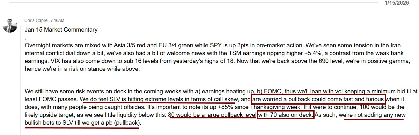 As you can see, we pretty much nailed this on the nose. We mentioned the super high call skew and are “worried a pullback could come fast and furious”…along with predicting “80 would be a large pullback level with 70 also on deck. As such, we’re not adding any new bullish bets to SLV till we get a pullback”